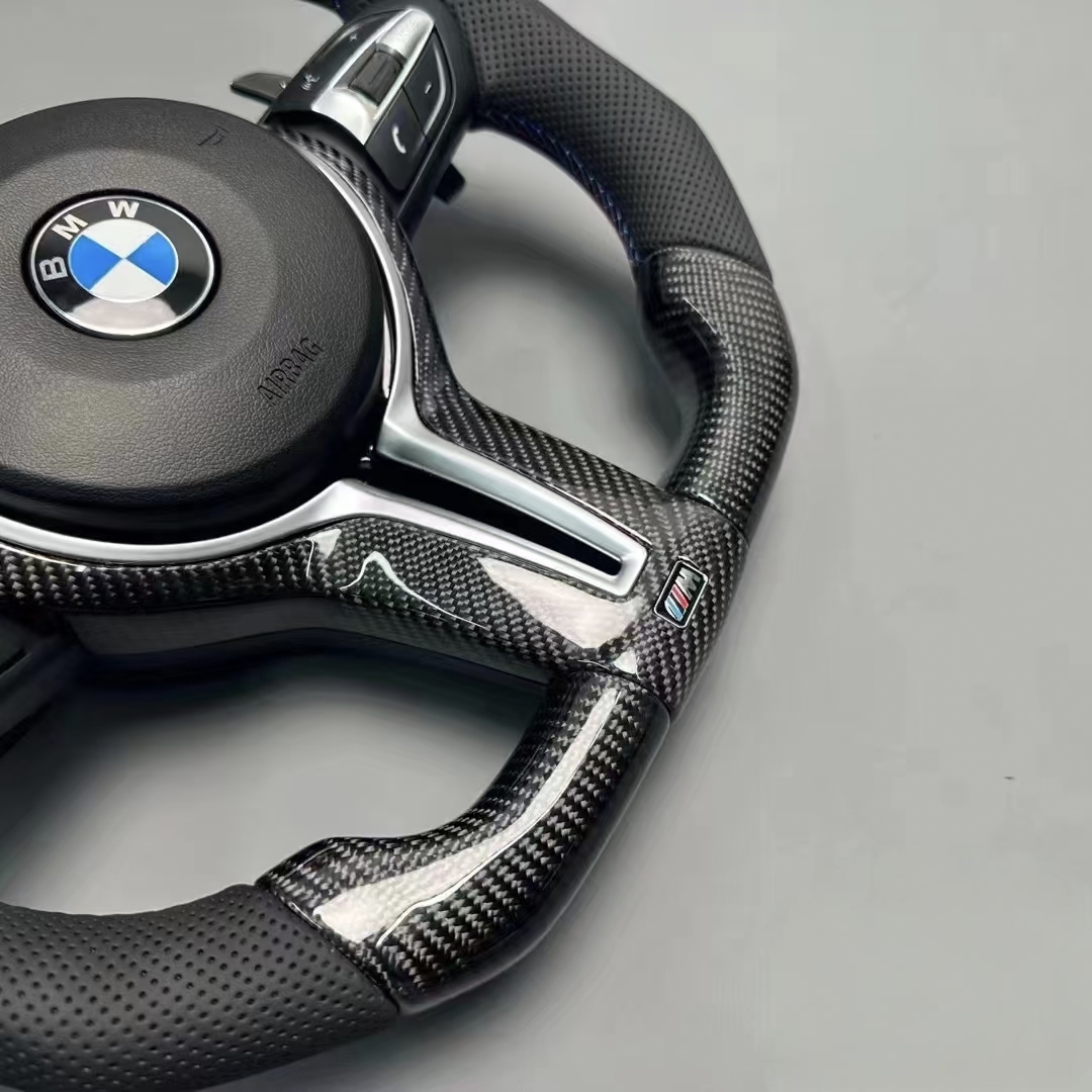 + Free ShippingBMW 1234567 series x1x2x3x4x5x6F02F30F15F20 sport flat bottomed carbon fiber steering wheel, made of carbon fiber material, with a comfortable feel. Adorned with blue stitching and featuring a tricolor logo design. The steering wheel is equipped with multifunctional buttons, supports cruise control and paddle shifters, and is easy to install without cutting. All wiring harnesses are neatly fixed and perfectly fit the original car design.