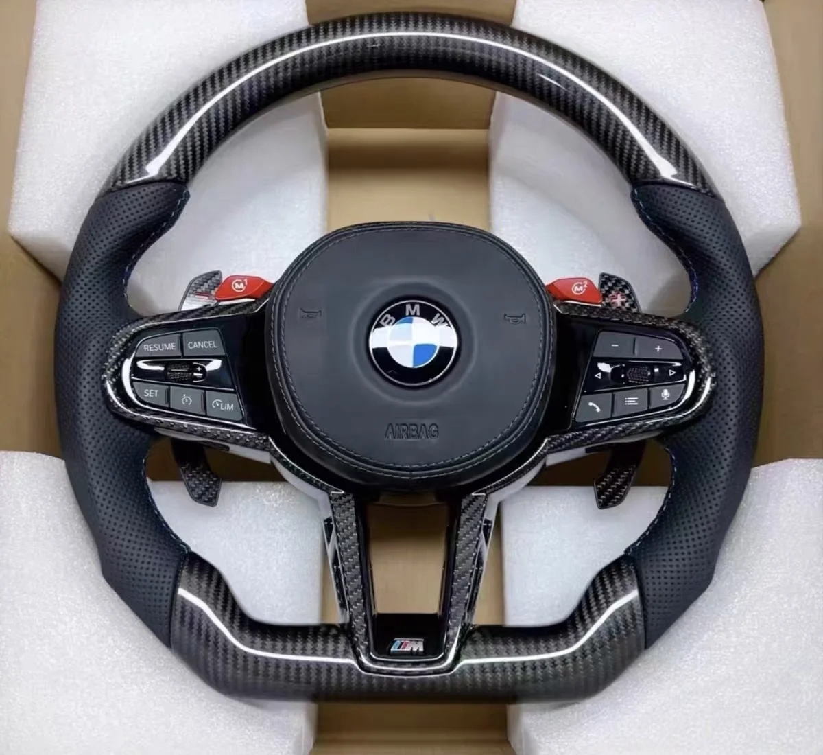 + Free ShippingBMW 1 2 3 4 5 6 7 Series F10 F30 G20 G30 X1 X3 X4 X5 X6 modified CS carbon fiber steering wheel, with original factory quality assurance. Made of black genuine leather material with blue stitching accents, it feels comfortable to the touch. The steering wheel is equipped with multifunctional buttons, supports cruise control and paddle shifters, and is easy to install without cutting. The carbon fiber decorative ring paired with red accents exudes a strong sense of sportiness. All wiring harnesses are neatly fixed and perfectly fit the original car design.