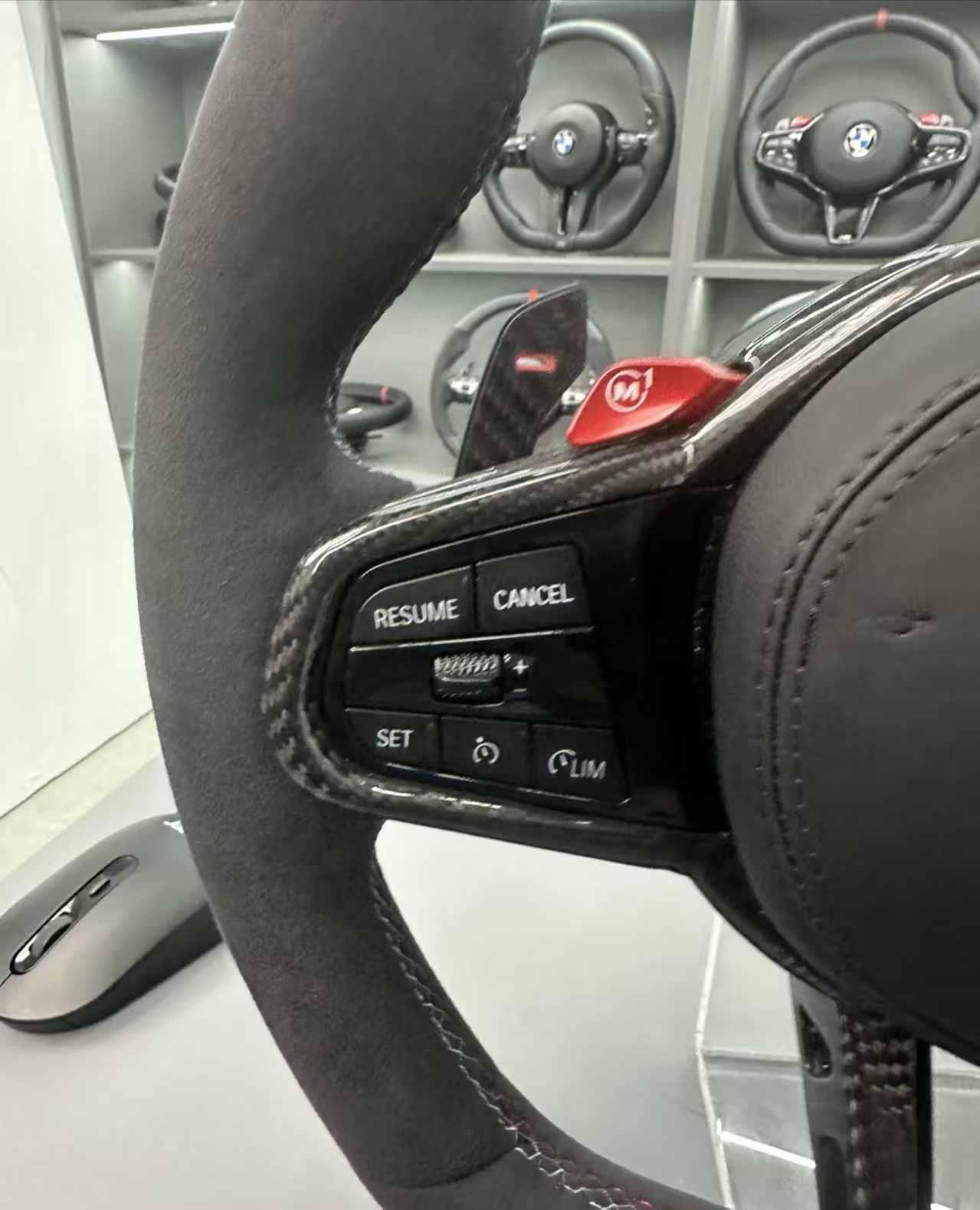 + Free ShippingDominant Material:The grip area is made of Alcantara suede. Compared with genuine leather, it offers stronger friction, excellent anti-slip performance, as well as a smooth, warm and durable hand feel, making it the preferred material for high-end modifications and racing-style customization.The central area of the spokes features a real carbon fiber texture, which creates a striking contrast with the matte texture of the Alcantara, delivering an extremely strong visual impact.