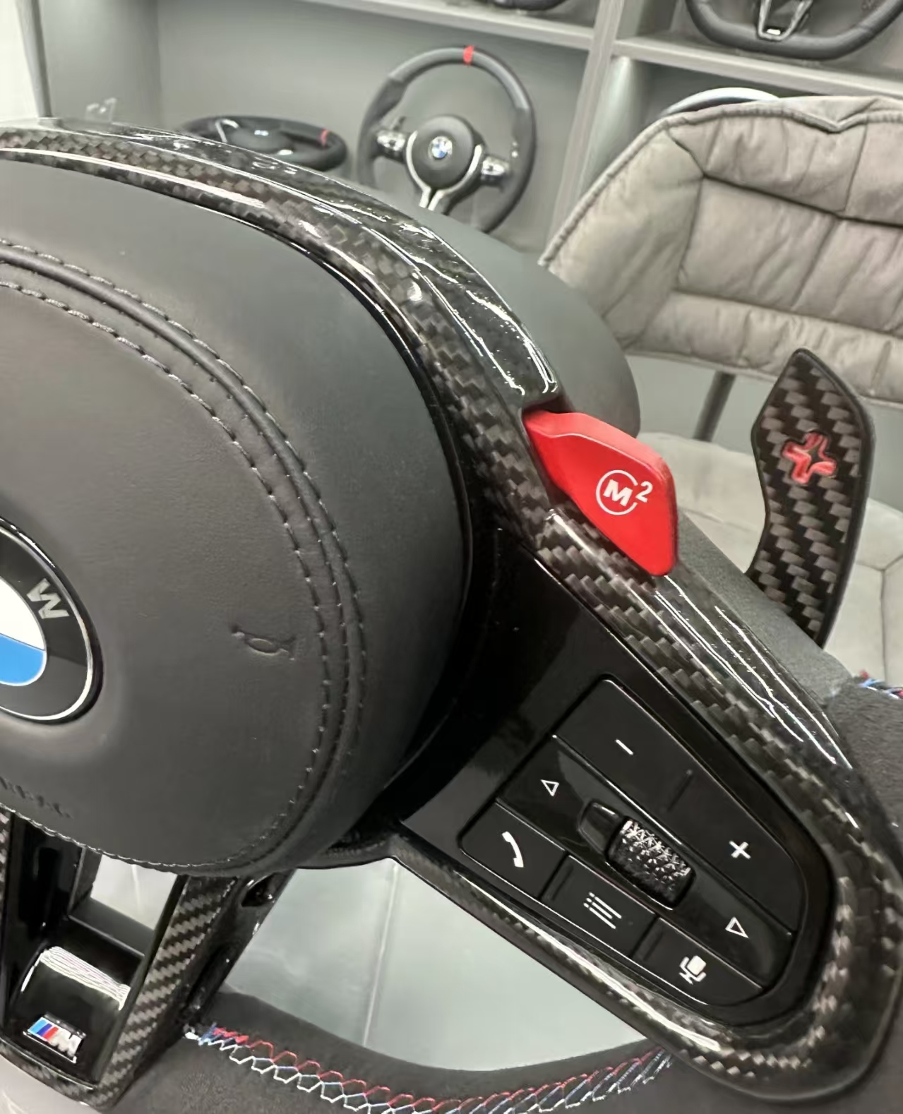 Functional Configuration:Equipped with full-touch multi-function buttons as standard, compatible with BMW’s latest ID8 infotainment system.Features a large red hollow metal shift paddle to enhance the ceremonial feel of operation.The bottom decorative panel is marked with M tricolor logos to strengthen the sporty attribute.